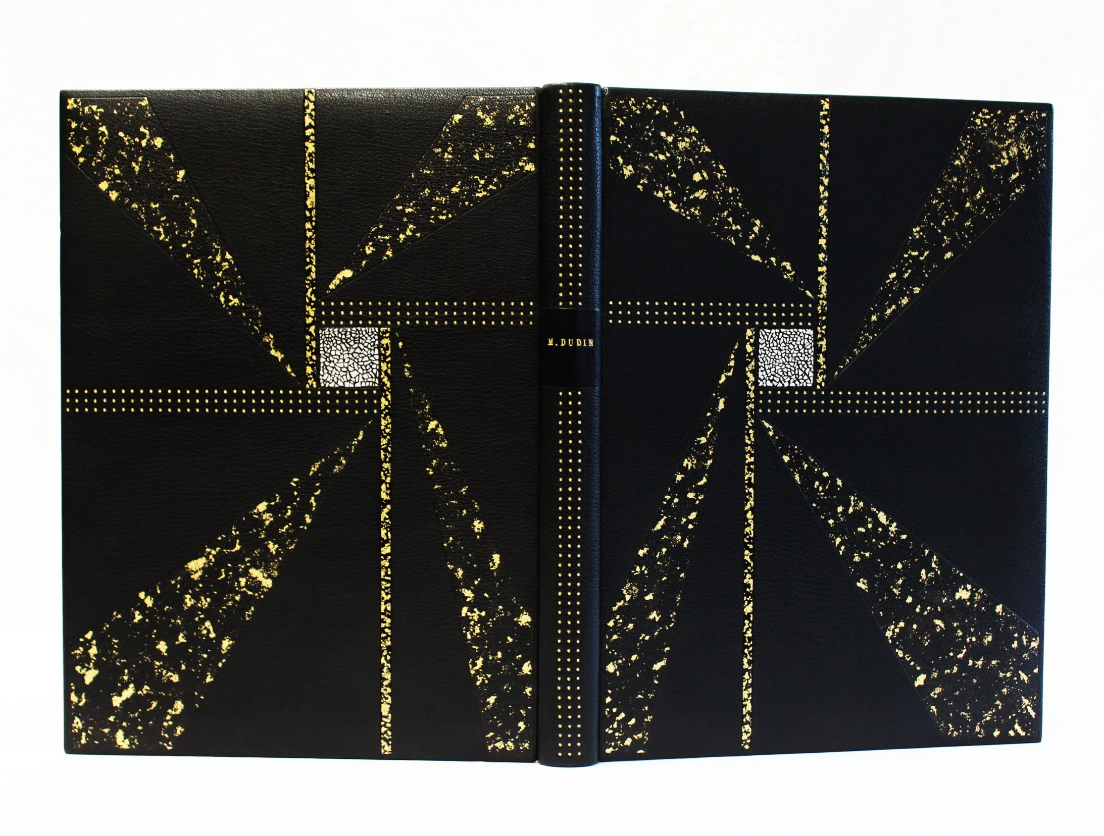 Full black goatskin with inlays of coquille d’oeuf (eggshell) lacquer and sunago gold lacquer, triangles of applied 22c gold leaf, linear dots and title on spine hand tooled in 22c yellow gold leaf, dentelles of applied gold leaf, inlays of reversed black and gold silk lamé, endpapers of sunago gold sprinkle on black Bugra Butten paper, head rough edge gilt, hand sewn black and white silk endbands with gold highlights. Housed in a black goatskin yapp edged chemise with sunago gold sprinkle sidings and a black goatskin entry étui (slipcase).